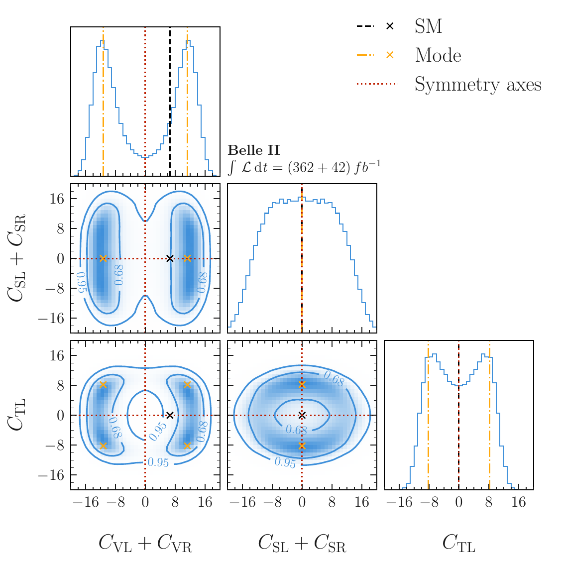 The marginalized posterior for the Wilson coefficients in Eq. (9). We adopt the convention that $C_{\mathrm{VL}}+C_{\mathrm{VR}}$, $C_{\mathrm{SL}}+C_{\mathrm{SR}}$ and $C_{\mathrm{TL}}$ are real valued. Diagonal and off-diagonal panels show the 1-dimensional and 2-dimensional sample density PDFs on a linear scale, respectively. The overall scale is omitted, as all relevant information is contained in the shape of the distribution. The contours indicate $68\%$ and $95\%$ credible intervals. The dashed black lines and cross mark the SM point; the dash-dotted yellow lines and cross indicate the posterior mode; dotted red lines mark the symmetry axes used for sample symmetrization.