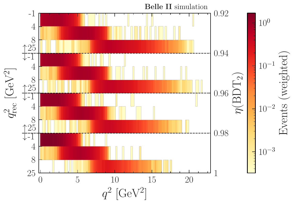 The ITA binned joint number densities. The horizontal axis corresponds to the generated $q^2$. The vertical axis represents the binning used in the ${B^{+}\to K^{+}\nu\bar{\nu}}$ analysis~\cite{Belle-II:2023esi}. The heatmap shows the weighted signal events.