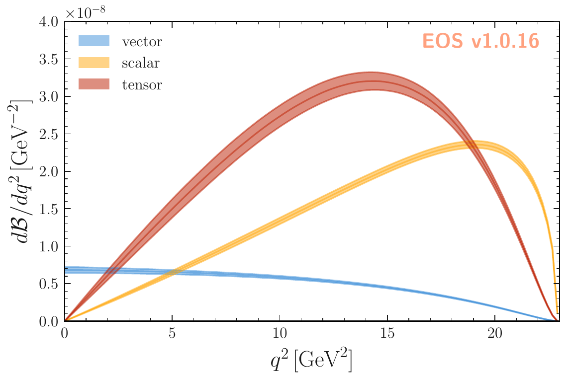 The ${B^{+}\to K^{+}\nu\bar{\nu}}$ differential branching fraction prediction from Eq. (9). Individual contributions are shown here with the combinations of vector, scalar and tensor Wilson coefficients set to unity, respectively. The uncertainties shown (bands) stem from the hadronic parameters.