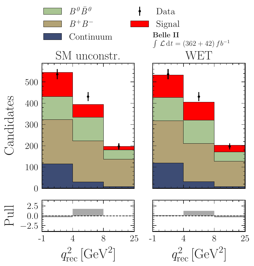 | Abstract | We recently measured the branching fraction of the $B^{+}\rightarrow K^{+}\nu\bar{\nu}$ decay using 362~fb$^{-1}$ of on-resonance $e^+e^-$ collision data under the assumption of Standard Model kinematics, providing the first evidence for this decay. To facilitate future reinterpretations and maximize the scientific impact of this measurement, we publicly release the full analysis likelihood along with all necessary material required for reinterpretation under arbitrary theoretical models sensitive to this measurement. In this work, we demonstrate how the measurement can be reinterpreted within the framework of the Weak Effective Theory. Using a kinematic reweighting technique in combination with the published likelihood, we derive marginal posterior distributions for the Wilson coefficients, construct credible intervals, and assess the goodness of fit to the Belle~II data. For the Weak Effective Theory Wilson coefficients, the posterior mode of the magnitudes $|C_\mathrm{VL}+C_\mathrm{VR}|$, $|C_\mathrm{SL}+C_\mathrm{SR}|$, and $|C_\mathrm{TL}|$ corresponds to the point ${(11.3, 0.0, 8.2)}$. The respective 95\% credible intervals are $[1.9, 16.2]$, $[0.0, 15.4]$, and $[0.0, 11.2]$. |